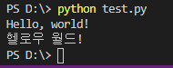 내가 생성한 경로에서 python 내가 만든 파이썬파일이름.py 명령어를 입력해줍니다. 그러면 아래처럼 결과가 나옵니다.