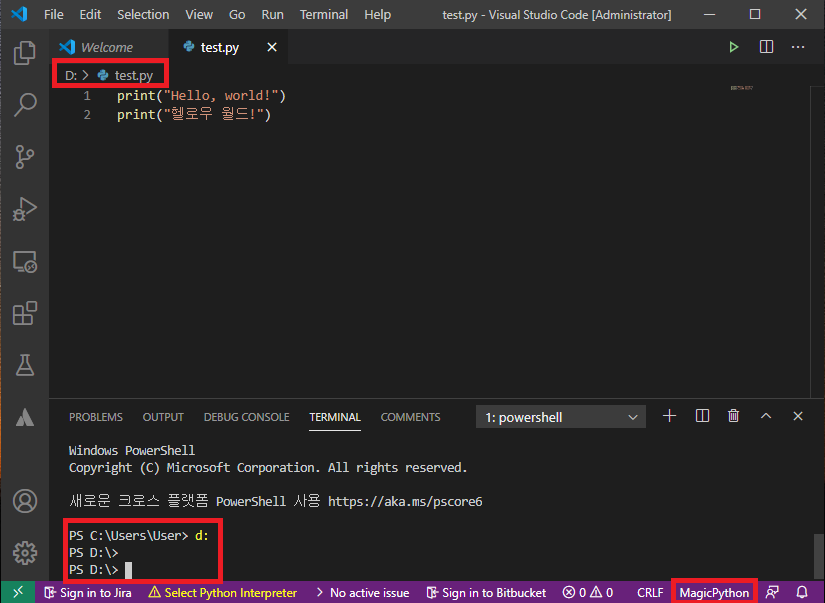 그리고 test.py라고 이름을 변경후 오른쪽 아래 빨간 네모박스처럼 MagicPython으로 변경을 해줍니다.